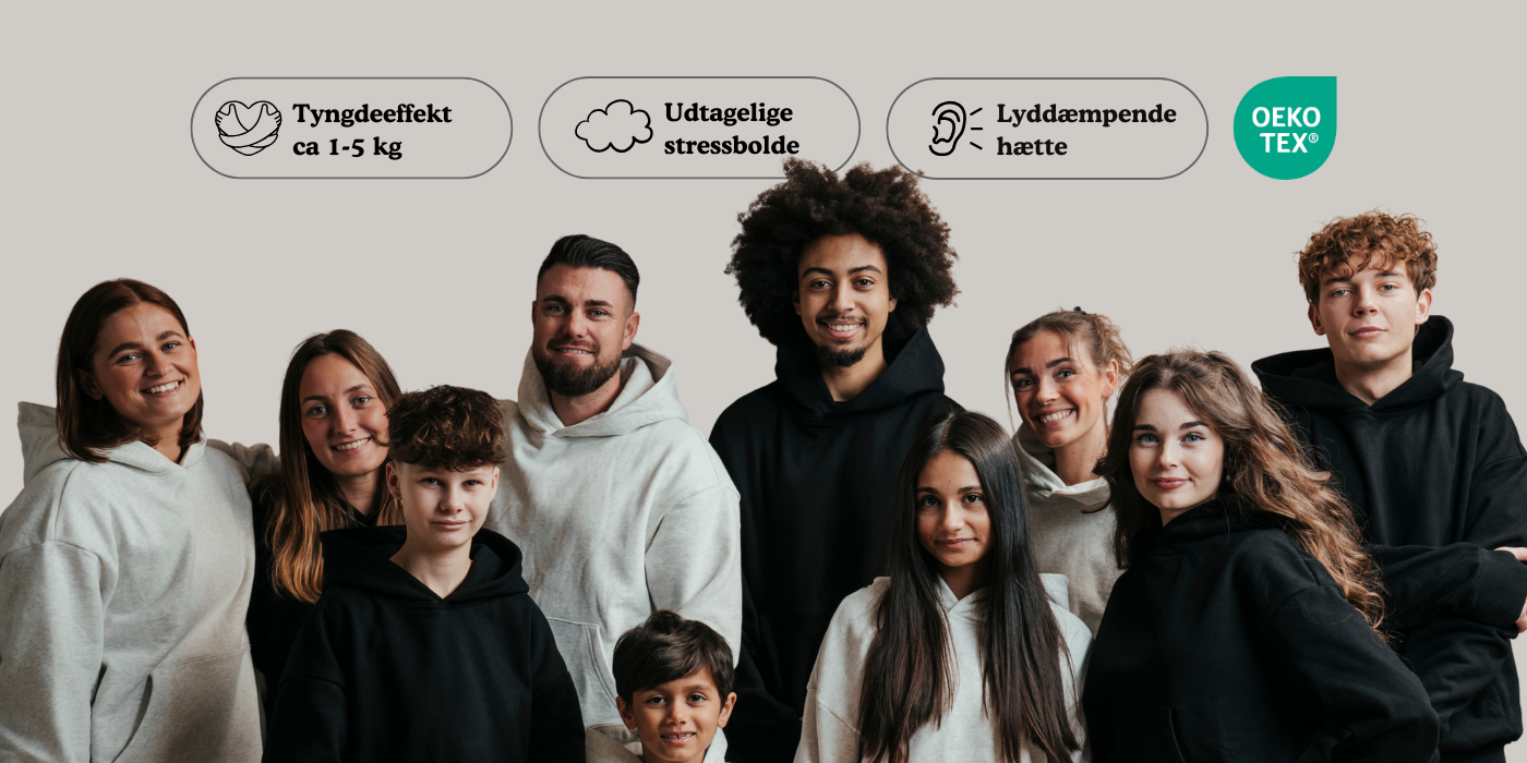 En tyngdehoodie er en hoodie som anvender vægt, designet til at give en følelse af tryghed og komfort. Tyngden fordeles jævnt over kroppen og skaber en sanselig oplevelse, som mange forbinder med ro og nærvær. Flere af vores kunder fortæller, at de oplever mere afslapning og og finder mere ro i hverdagen – særligt i situationer med mange indtryk.