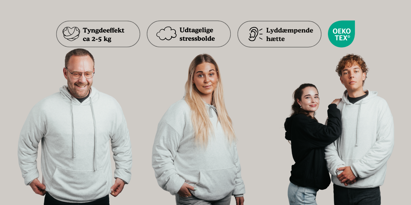 En tyngdehoodie er en hoodie som anvender vægt, designet til at give en følelse af tryghed og komfort. Tyngden fordeles jævnt over kroppen og skaber en sanselig oplevelse, som mange forbinder med ro og nærvær. Flere af vores kunder fortæller, at de oplever mere afslapning og og finder mere ro i hverdagen – særligt i situationer med mange indtryk.